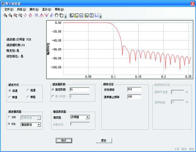 按濾波器方式分:低通、高通、帶通 、 帶阻四種濾波器 。 按濾波器類型分:有 IIR 濾波器(巴特 沃 斯 , 切 比 雪夫)、 FIR 濾波器(窗函數設計、 Remez 設計等)。有幅頻響應、相頻相應(解卷繞)、系數顯示、脈沖響應等顯示。 |